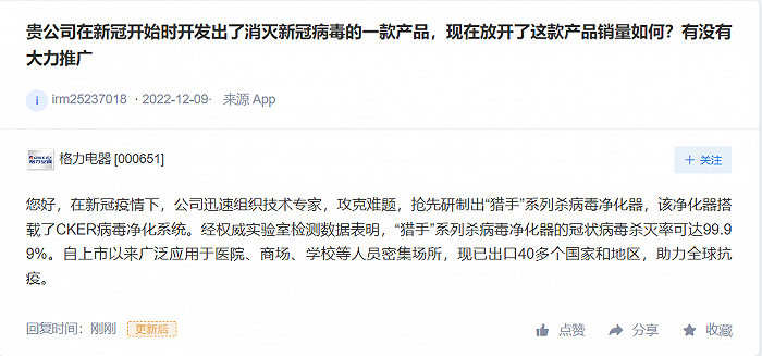 1月14日,格力电器在互动平台表示,公司“猎手”系列杀病毒净化器搭载了CKER病毒净化系统。经权威实验室检测数据表明,“猎手”系列杀病毒净化器的冠状病毒杀灭率可达99.99%。
