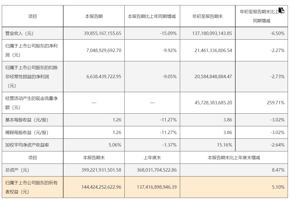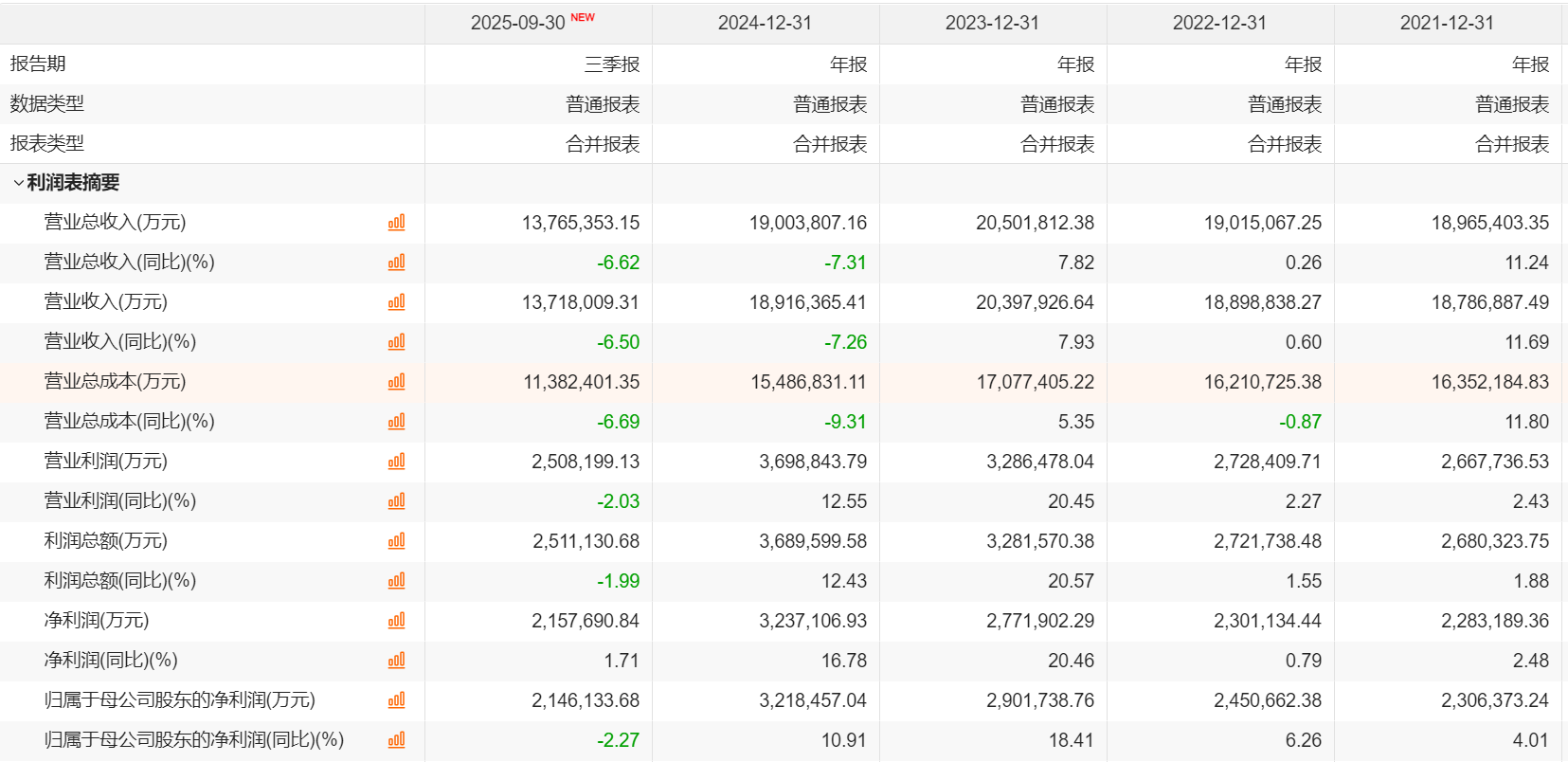 格力电器的2025年前三季财报显示,这家空调巨头的营收和净利润正在失速。今年前三季度格力电器营收1371.8亿元,同比下降6.5%;归属于上市公司股东的净利润214.61亿元,同比下降2.27%,扣非净利润同比下降2.73%。其中,三季度,格力电器营收398.55亿元,同比降幅扩大至15.09%;归母净利润70.49亿元,同比下滑9.92%,营收与利润的单季下滑幅度均远超前三季度整体水平。