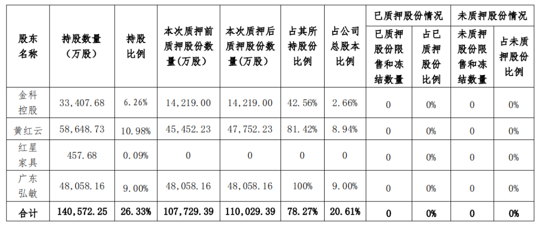 图/?金科股份官方公告(金科控股、黄红云先生及其一致行动人累计被质押的情况)