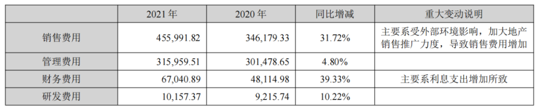 在金科股份高增长的营业成本里,有一个比较亮眼的数据:2021年金科股份的财务费用约6.70亿元,同比增长39.33%。