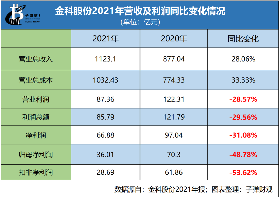 据金科股份2021年报显示:全年实现营业收入1123.10亿元,同比增长28.06%;营业利润87.36亿元,同比下降28.57%;净利润66.88亿元,同比下降31.08%;而归母净利润只有36.01亿元,同比跌幅更是达到了48.78%。