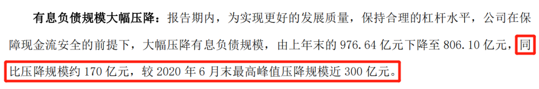 据金科股份2021年报数据显示:截至2021年末,有息负债余额下降至806.10亿元,相比于上年末的976.64亿元下降了约170 亿元,较2020年6月末最高峰值压降规模近300亿元。