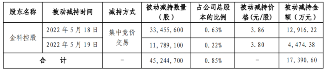 5月20日公告称:金科股份中信证券信用担保账户持有的部分公司股份于5月18日和19日被中信证券强制平仓,被动减持4524.47万股。本次减持股份占金科股份总股本的0.85%,折合减持金额约1.74亿元。
