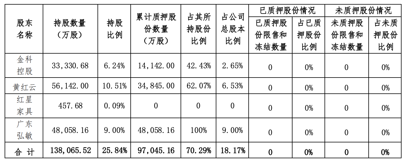 根据公告显示,截至公告披露日,公司控股股东金科控股及一致行动人黄红云、广东弘敏企业管理咨询有限公司(以下简称“广东弘敏”)、红星家具集团有限公司(以下简称“红星家具”)所持质押股份数量97045.16股,占其所持股份比例70.29%,占公司总股本比例为18.17%。