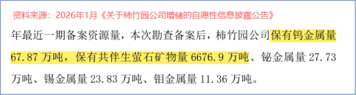 2026年初,柿竹园发布增储相关公告,新增钨金属查明资源量9.17万吨,新增共伴生萤石矿物量2442.60万吨……此次钨新增量达到大型规模,萤石新增资源量达到超大型,公司矿产资源储备更加丰厚。