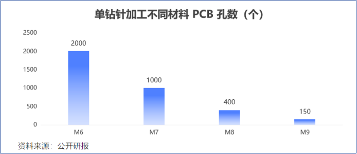PCB板越厚,钻针用量就越多。加工8mm板单孔,需要使用四支长度不同的钻针。从M6到M9夹层材料升级,导致钻针损耗剧增,单针加工寿命从两千孔降至150孔,更换频率相应提高。