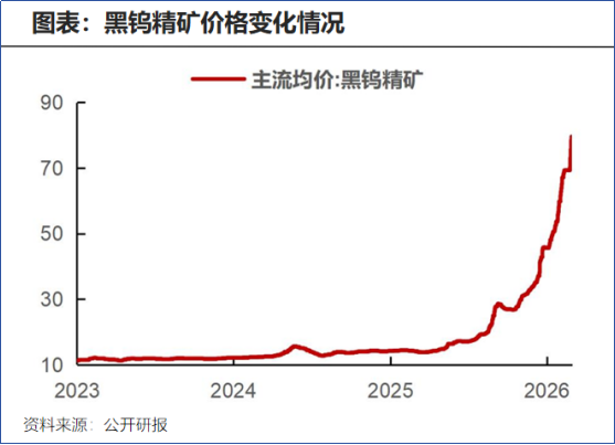 多重因素下,钨矿价格快速上涨。2025上半年,黑钨精矿价格缓慢爬坡,后面全力奔跑。进入2026年来,江西钨精矿价格累计增长超50%,2月下旬,黑钨精矿价格高达78.4万元/吨,增长势头不减。