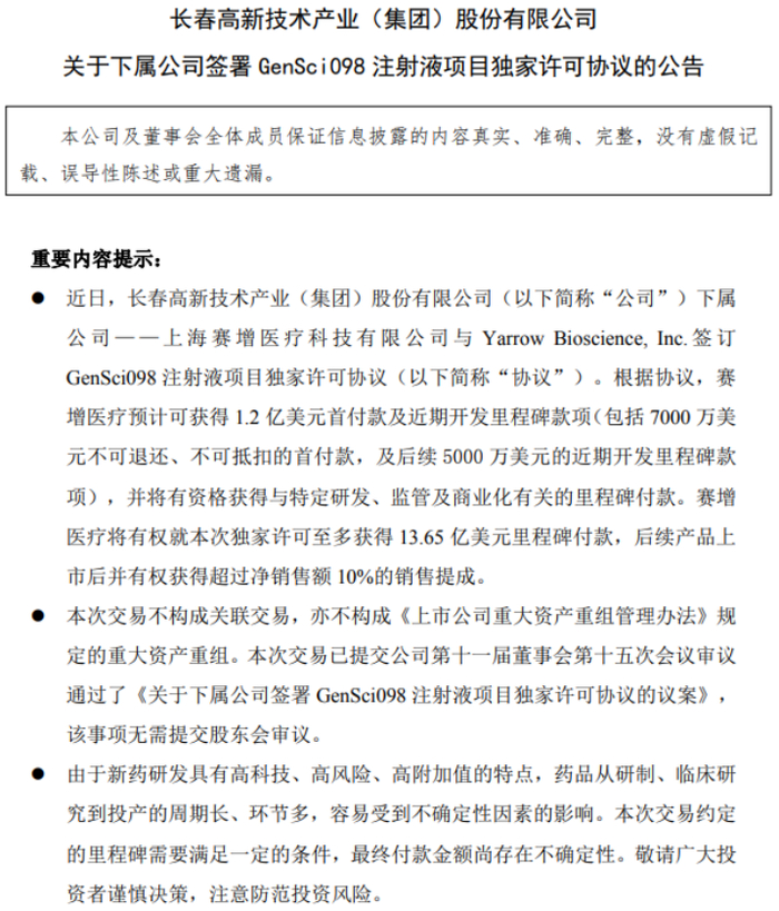 2025年12月15日晚间,长春高新发布公告,下属公司上海赛增医疗科技有限公司(以下简称“赛增医疗”)与Yarrow Bioscience,Inc.签订GenSci098注射液项目独家许可协议。