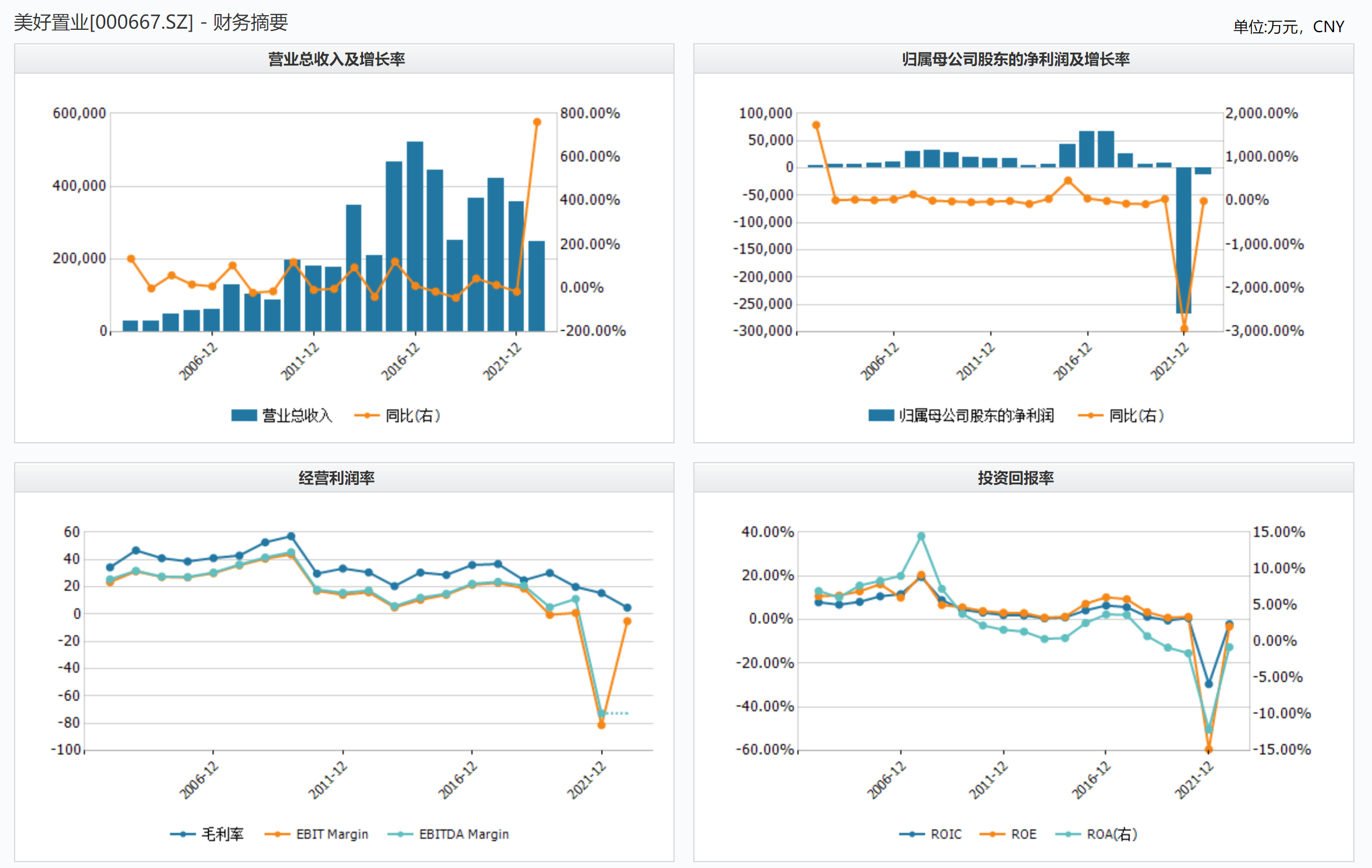 但2016年之后,美好置业的发展势头开始扭转,营收开始波动下行,特别是在2018年与2021年。2018年,美好置业仅实现营收25.20亿元,同比大幅下滑43.21%;2021年,美好置业实现营收35.60亿元,同比下滑15.37%,这也是自2015年来营收总额倒数第二低的年份,与此同时归属母公司的净亏损更是高达26.73亿元,几乎抹平了过往20年的归母净利润总和。