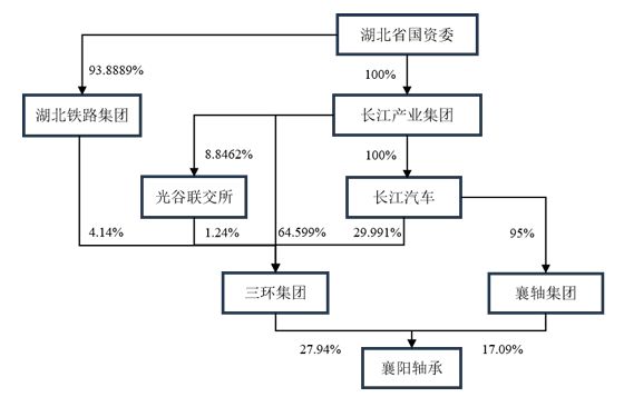 与此同时,湖北省国资委于2025年12月26日出具《省政府国资委关于划转三环集团有限公司国有股权的通知》,将其持有的三环集团64.599%的股权无偿划转至长江产业投资集团有限公司(以下简称长江产业集团),划转完成后长江产业集团通过三环集团和襄阳轴承投资发展集团有限公司间接控制襄阳轴承的股份比例达到45.03%,襄阳轴承的实际控制人仍为湖北省国资委。