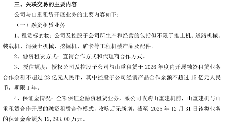 公告显示授权公司及控股子公司与山重租赁于2026年度内开展融资租赁业务合作余额不超过23亿元人民币,其中控股子公司经销产品合作余额不超过15亿元人民币,期限1年。
