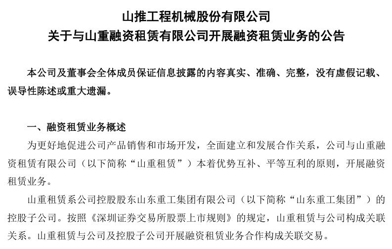 为更好地促进公司产品销售和市场开发,全面建立和发展合作关系,公司与山重融资租赁有限公司(以下简称“山重租赁”)本着优势互补、平等互利的原则,开展融资租赁业务。