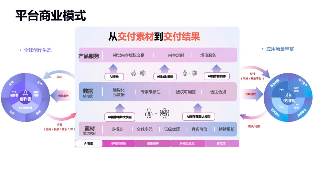 从“交付素材”升级为“交付成品”,提供AI智能搜索、灵感定向推荐、智能配图、一键成片、对话式修图等核心产品矩阵。