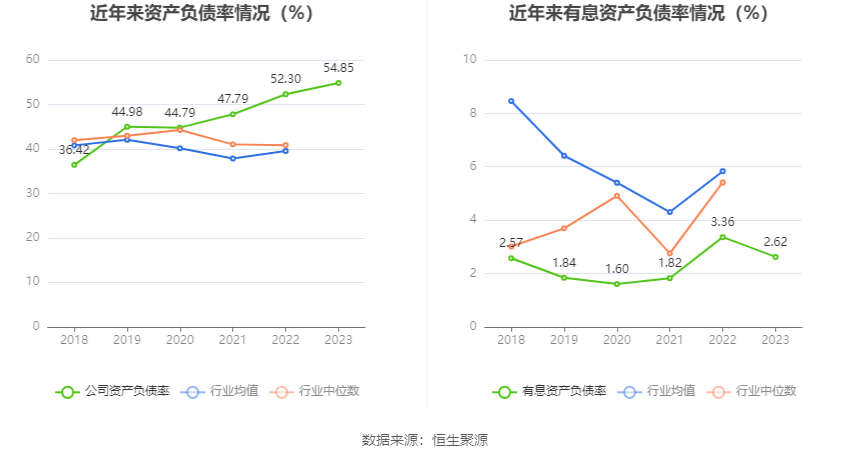 在偿债能力方面,公司2023年年末资产负债率为54.85%,相比上年末上升2.55个百分点;有息资产负债率为2.62%,相比上年末下降0.74个百分点。