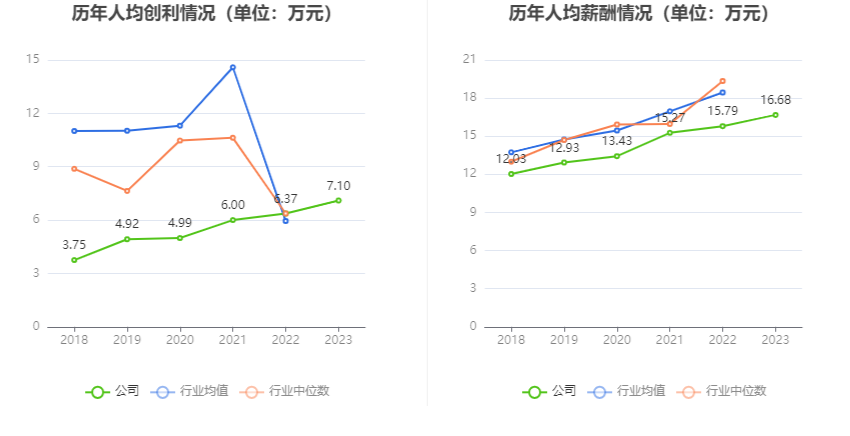 截至2023年末,公司员工总数为7627人,人均创收84.94万元,人均创利7.10万元,人均薪酬16.68万元,较上年同期分别增长7.08%、11.44%、5.65%。