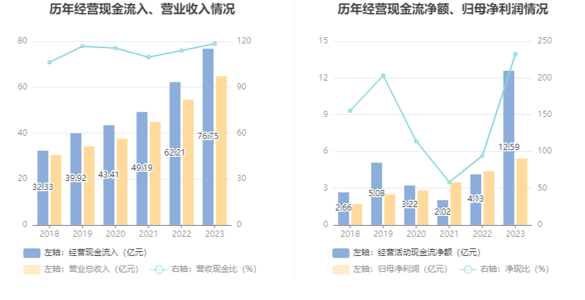 2023年,公司营业收入现金比为118.47%,净现比为232.58%。