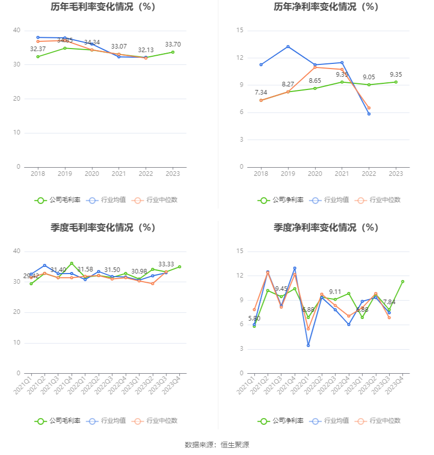 2023年,公司毛利率为33.70%,同比上升1.57个百分点;净利率为9.35%,较上年同期上升0.30个百分点。从单季度指标来看,2023年第四季度公司毛利率为34.99%,同比上升2.18个百分点,环比上升1.66个百分点;净利率为11.31%,较上年同期上升1.47个百分点,较上一季度上升3.47个百分点。