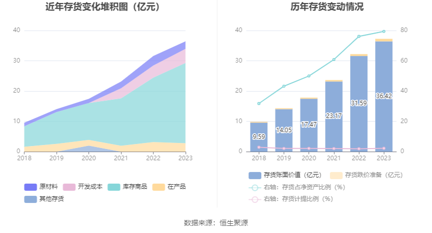 从存货变动来看,截至2023年年末,公司存货账面价值为36.42亿元,占净资产的79.44%,较上年末增加4.83亿元。其中,存货跌价准备为8381.48万元,计提比例为2.25%。