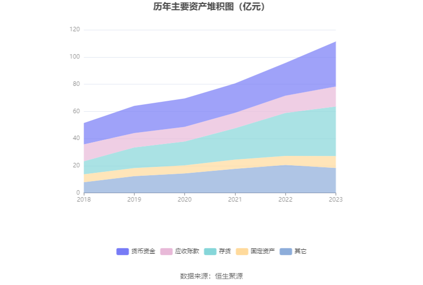 2023年,公司期间费用为15.72亿元,较上年同期增加2.36亿元;但期间费用率为24.27%,较上年同期下降0.20个百分点。其中,销售费用同比增长17.9%,管理费用同比增长17.72%,研发费用同比增长22.84%,财务费用由去年同期的-2993.73万元变为-5971.20万元。
