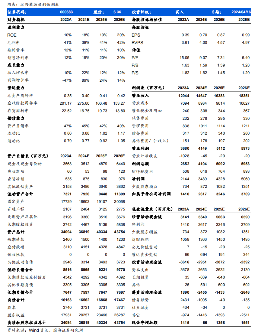 2024年4月15日,远兴能源发布2023年年度报告:2023年实现营业收入120.4亿元,同比增长9.6%;实现归母净利润14.1亿元,同比下降47.0%;实现扣非后归母净利润24.1亿元,同比下降9.4%;销售毛利率41.1%,同比增长0.3个pct,销售净利率17.8%,同比下降11.2个pct;经营活动现金流净额为31.4亿元。