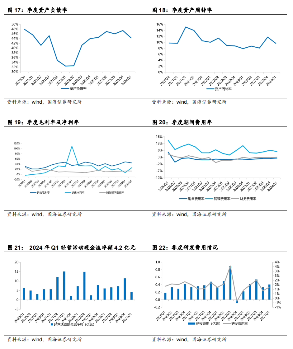 2024年Q1单季度,公司实现营业收入32.8亿元,同比+31.0%,环比-18.1%;实现归母净利润为5.7亿元,同比-12.7%,环比-59.6%;扣非后归母净利润5.68亿元,同比下降13%,环比下降35.1%;经营活动现金流净额为4.2亿元。销售毛利率为44.5%,同比+2.9个pct,环比-4.0个pct。销售净利率为26.0%,同比-5.1个pct,环比+19.2个pct。