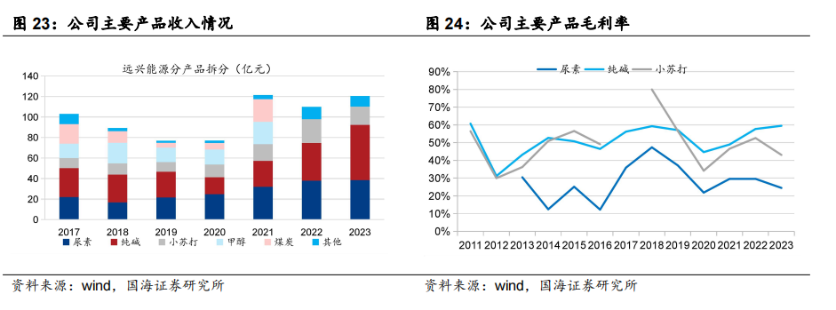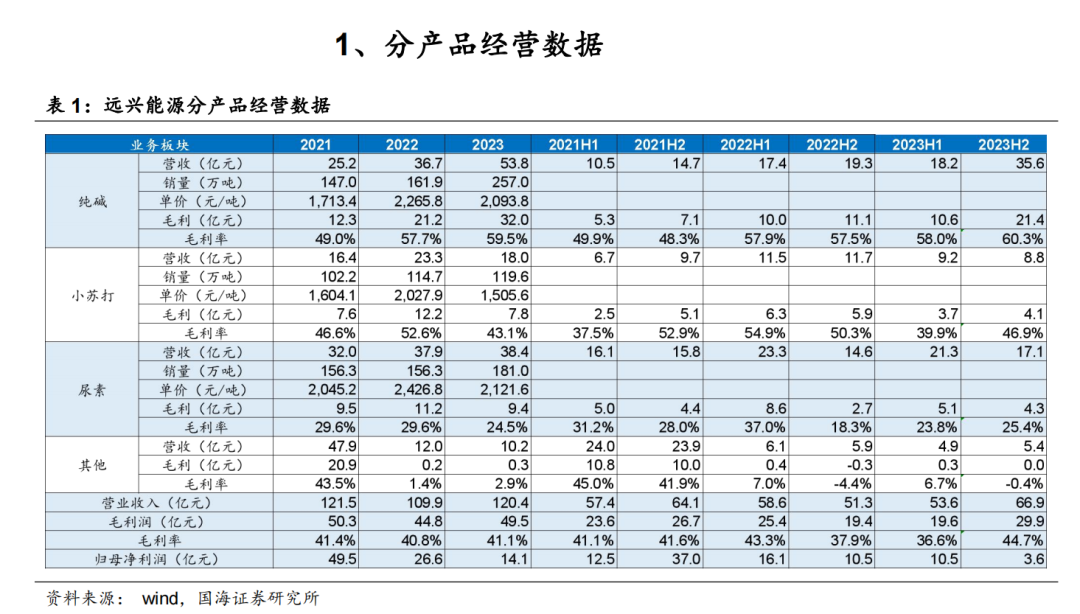 2023年,公司实现营业收入120.4亿元,同比增长9.6%;实现归母净利润14.1亿元,同比下降47.0%;实现扣非后归母净利润24.1亿元,同比下降9.4%。归母净利润同比下滑较多,一方面,主要由于纯碱、尿素产品市场价格下滑;另一方面,主要参股公司蒙大矿业投资收益减少,叠加蒙大矿业诉讼事项计提预计负债9.64亿元产生非经常性损益。分业务板块来看,2023年纯碱业务实现营业收入53.8亿元,同比+47%,实现销量257万吨,同比+59%,价格为2094元/吨,同比-8%,毛利率为59.5%,同比增长1.8个pct,2023年阿拉善一期部分生产线投料,产能逐步释放,一定程度对冲了纯碱价格下降带来的不利影响。小苏打业务实现营业收入18.0亿元,同比-23%,主要由于小苏打价格同比下滑26%至1506元/吨,实现销量120万吨,同比+4%,毛利率为43.1%,同比下滑9.5个pct。尿素业务实现营业收入38.4亿元,同比+1%,销量为181万吨,同比+16%,单价为2122元/吨,同比-13%,毛利率为24.5%,同比-5.1个pct。