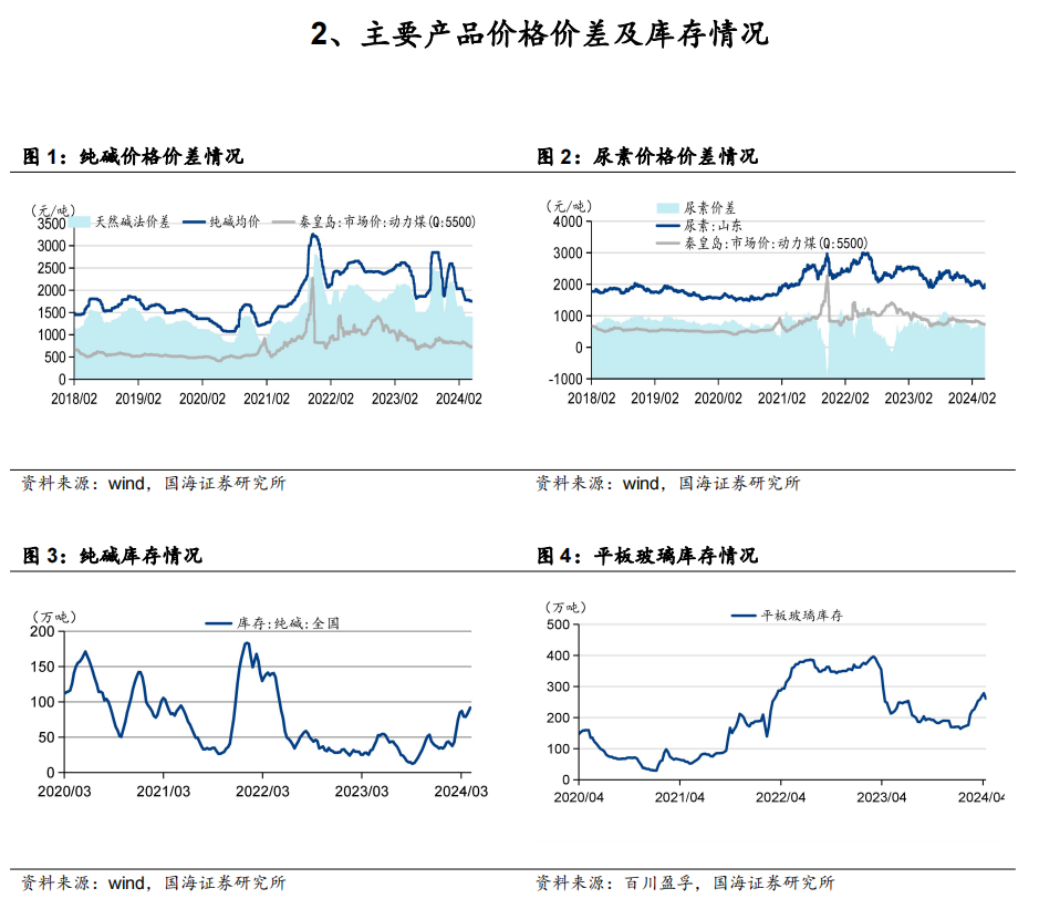 2024年Q1单季度实现扣非后归母净利润为5.7亿元,同比-0.9亿元,环比-3.1亿元。一方面,主要由于纯碱、小苏打、尿素等主营产品价格价差下滑,2024Q1纯碱、小苏打、尿素价格分别为1986、1593、2041元/吨,同比分别为-22%、-19%、-19%,环比分别-20%、-16%、-9%;纯碱、小苏打、尿素价差分别为1581、1136、670元/吨,同比分别为-22%、-19%、-15%,环比分别变动-20%、-19%、-15%。另一方面,煤炭市场价格下滑导致参股公司蒙大矿业确认投资收益减少,2024年Q1公司对联营企业和合营企业的投资收益为0.6亿元,同比减少1.5亿元,环比减少0.9亿元。