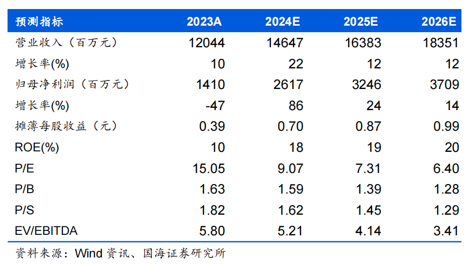 基于公司阿拉善项目投产进度、纯碱行业供需格局趋势以及价格价差情况,预计公司2024/2025/2026年营业收入分别为146.47、163.83、183.51亿元,归母净利润分别为26.17、32.46、37.09亿元,对应PE为9、7、6倍。公司阿拉善一期逐步投产,二期已启动建设,看好公司未来成长性,维持“买入”评级。
