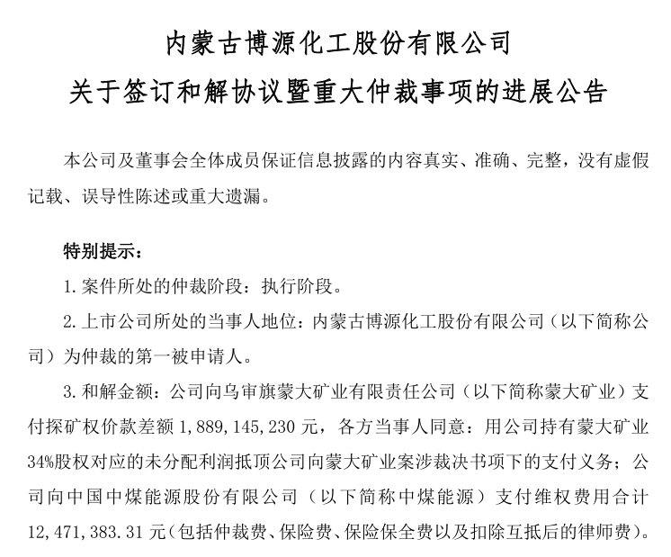 公告披露,本次和解源于中国国际经济贸易仲裁委员会〔2025〕中国贸仲京裁字第2936号终局裁决,裁决确定博源化工与上海证大需连带向蒙大矿业支付探矿权价款差额18.89亿元,向中煤能源支付仲裁费、保全费、律师费等维权费用1247.14万元。