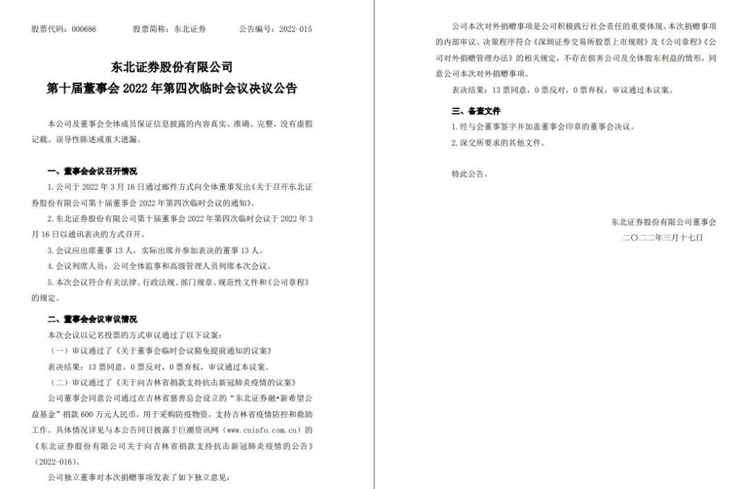 继取消原定于3月16日召开的股东大会之后,东北证券在当天紧急通知召开董事会会议。全体13位董事审议通过了《关于董事会临时会议豁免提前通知的议案》,以及《关于向吉林省捐款支持抗击新冠肺炎疫情的议案》。