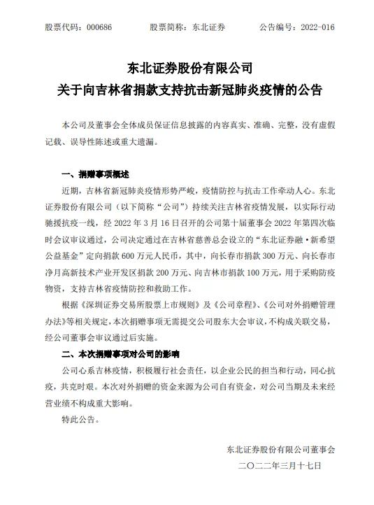 据悉,东北证券通过在吉林省慈善总会设立的“东北证券融·新希望公益基金”捐款600万元人民币,用于采购防疫物资,支持吉林省疫情防控和救助工作。