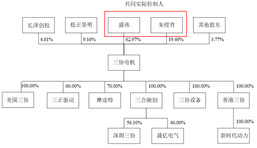 发行人共同实际控制人为盛祎、朱绶青。盛祎与朱绶青为夫妻。盛祎直接持有发行人62.97%的股份;朱绶青直接持有发行人19.49%的股份。盛祎、朱绶青合计控制发行人82.46%的股份。2002年11月至今,盛祎担任三协电机总经理,股份公司成立后担任董事长。