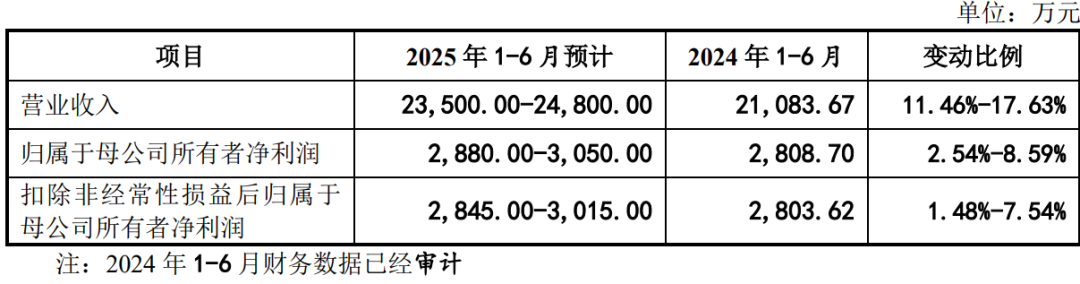 公司预计2025年1-6月营业收入约为23,500.00万元至24,800.00万元,同比增长幅度约为11.46%至17.63%;归属于母公司所有者的净利润约为 2,880.00万元至3,050.00万元,同比增长幅度约为2.54%至8.59%;归属于母公司所有者的扣除非经常性损益后的净利润约为2,845.00 万元至3,015.00万元,同比增长幅度约为1.48%至 7.54%。