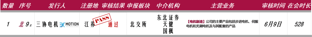 6月9日,北交所安排常州三协电机股份有限公司上会审议,这也是今年北交所第9次安排上会审核企业,结果也是顺利通过。