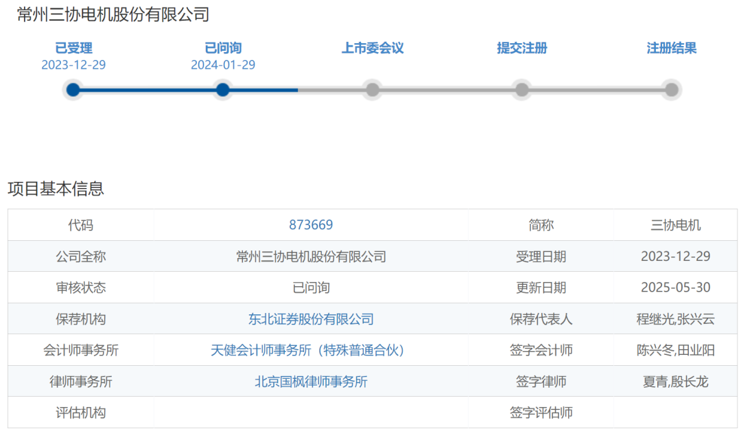 三协电机是东北证券保荐的项目,也是2025年第2单IPO过会项目,上一个是5月30日过会的世昌股份现已提交注册。