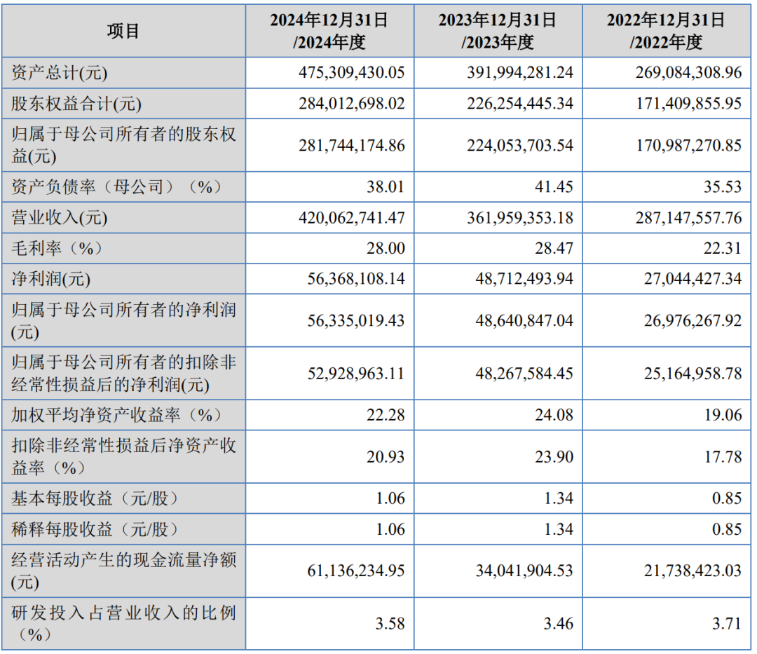 报告期内,公司营业收入分别为28,714.76万元、36,195.94万元和42,006.27万元,归属于公司股东扣除非经常性损益后的净利润分别为2,516.49万元、4,826.75万元和5,292.89万元。