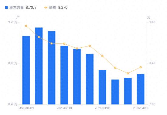 近一年(2025年4月10日至2026年4月10日),东北证券A股股东户数从8.33万户,增加至8.7万户,增幅4.39%,区间股价上涨15.50%。