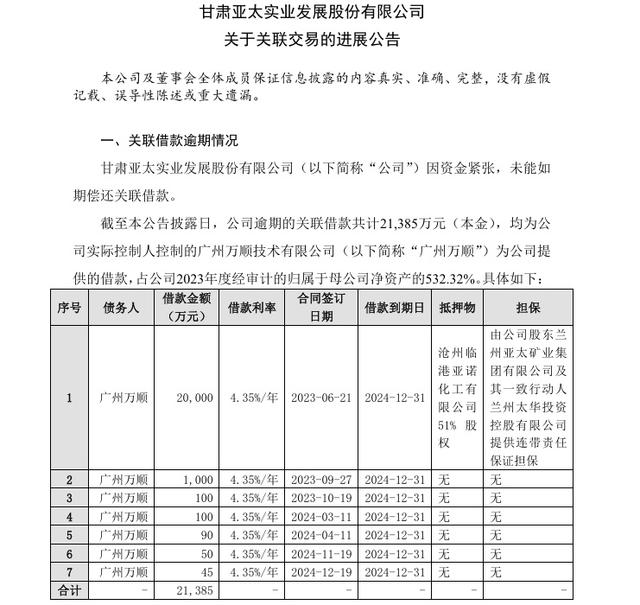 1月2日,亚太实业(000691)发布关于关联交易的进展公告。公告称,公司因资金紧张,未能如期偿还关联借款,截至公告披露日,逾期的关联借款共计2.14亿元(本金),均为公司实际控制人控制的广州万顺技术有限公司(下称“广州万顺”)提供的借款,占公司2023年度经审计的归属于母公司净资产的532.32%。