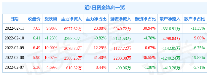 资金流向数据方面,当日主力资金净流入6977.62万元,游资资金净流入9040.72万元,散户资金净流出3316.91万元。近5日资金流向一览见下表: