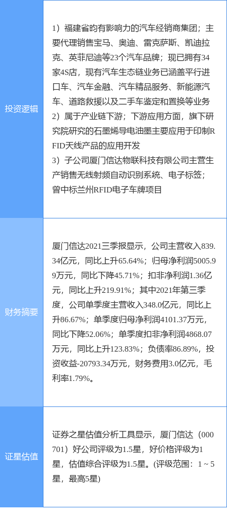 厦门信达涨停收盘,收盘价7.05元。该股于9点33分涨停,2次打开涨停,截止收盘封单资金为3781.56万元,占其流通市值1.32%。