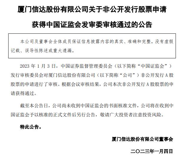 中国经济网北京1月4日讯厦门信达股份有限公司(简称“厦门信达”,000701.SZ)昨晚发布关于非公开发行股票申请获得中国证监会发审委审核通过的公告。2023年1月3日,中国证券监督管理委员会发行审核委员会对厦门信达非公开发行A股股票的申请进行了审核。根据会议审核结果,公司本次非公开发行A股股票的申请获得通过。