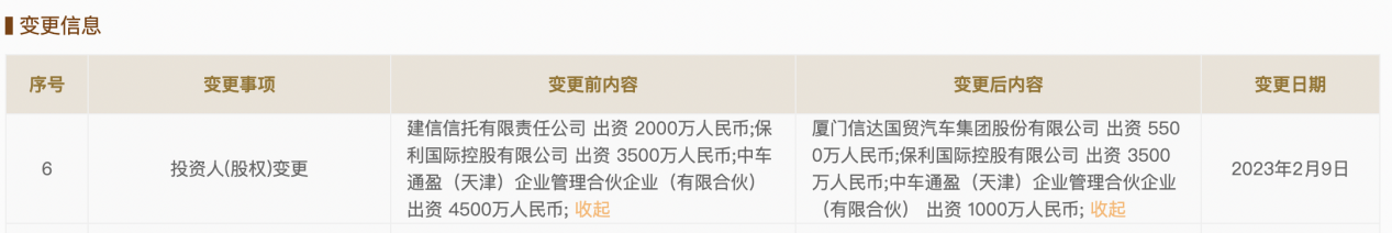 据乐居财经查阅,保利汽车股东变更,中车通盈(天津)企业管理合伙企业(有限合伙)持股比例从45%下降到10%,建信信托有限责任公司退出20%股份,新增厦门信达国贸汽车,持股55%。