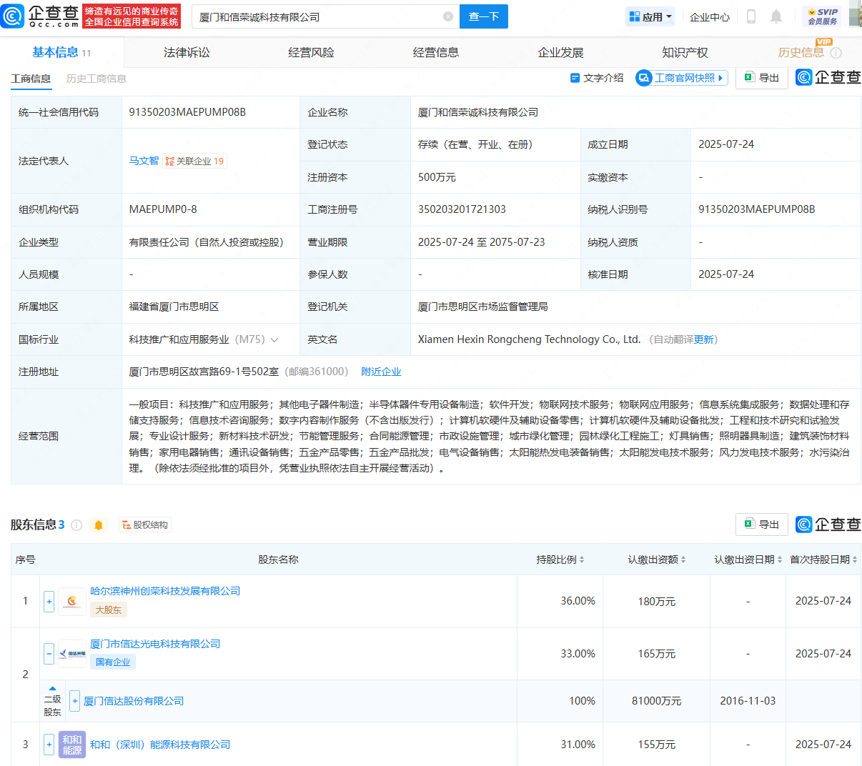 资料显示,近日,厦门和信荣诚科技有限公司成立,法定代表人为马文智,注册资本为500万元,经营范围包含:其他电子器件制造;半导体器件专用设备制造;软件开发;物联网技术服务;物联网应用服务等。股权穿透显示,该公司由哈尔滨神州创荣科技发展有限公司、厦门信达(000701)全资子公司厦门市信达光电科技有限公司等共同持股。