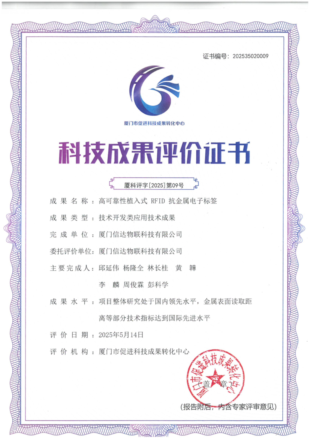 2025年,信达物联研发技术成果“高可靠性植入式 RFID 抗金属电子标签”,通过厦门市促进科技成果转化中心专家评定,专家组一致认为该项目整体研究达国内领先水平,其中在金属表面的读取距离等部分技术指标达到国际先进水平。该产品与同类产品相比,在电性能参数和应用场域覆盖上优势显著,技术先进性与市场竞争力突出。