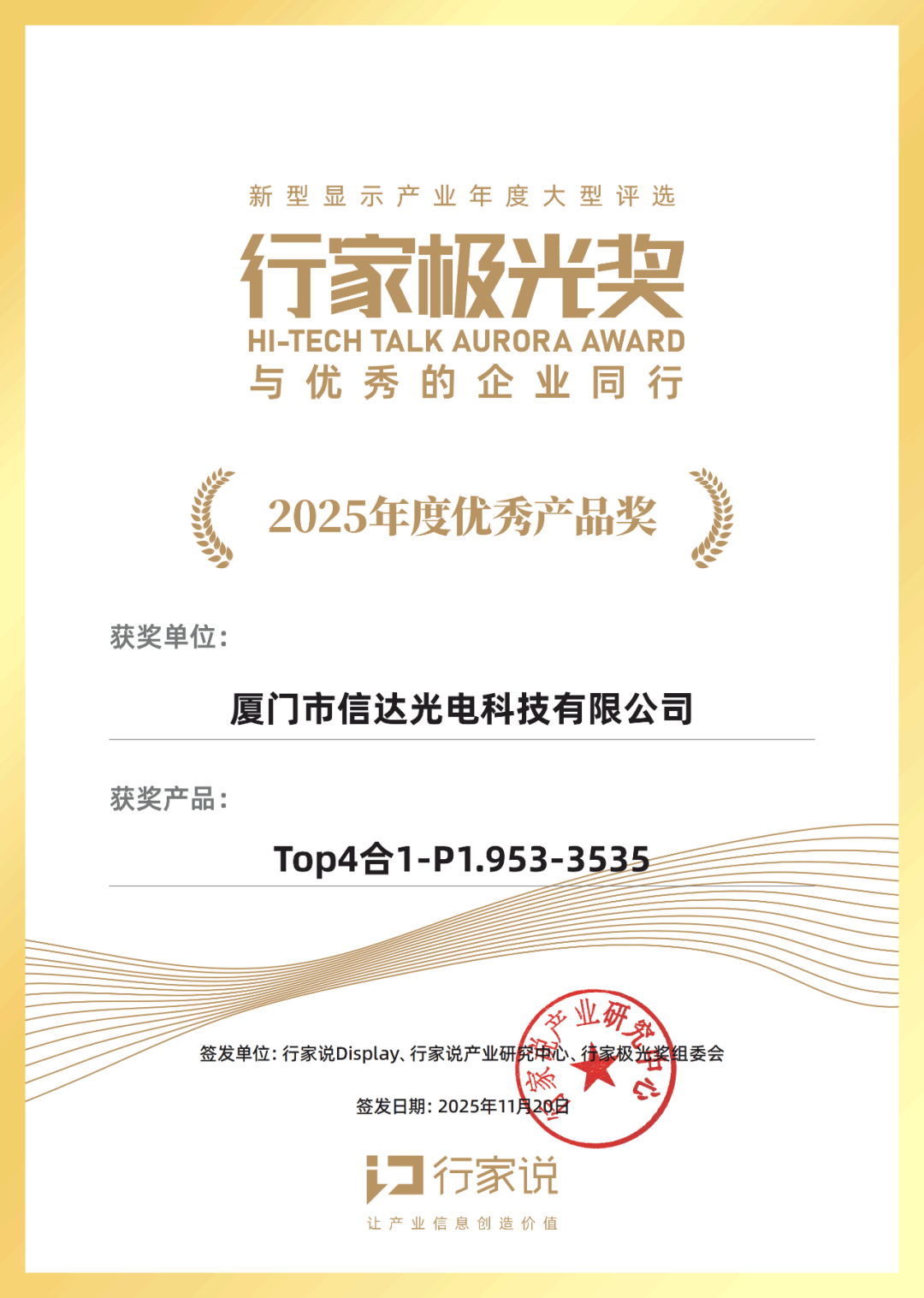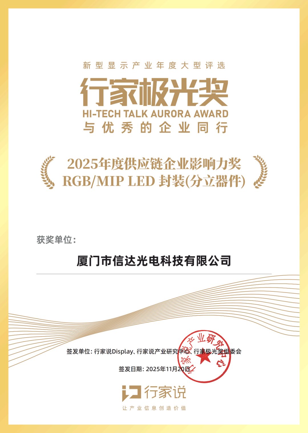 2025年,信达光电荣获“中国LED照明灯饰行业100强”与行家极光奖“2025年度供应链企业影响力奖”,租赁显示定制产品摘得优秀产品奖;照明设计团队凭借厦门轨道交通6号线及漳州延伸段的创新照明方案,获“DALI 中国奖·优秀设计团队银奖”。