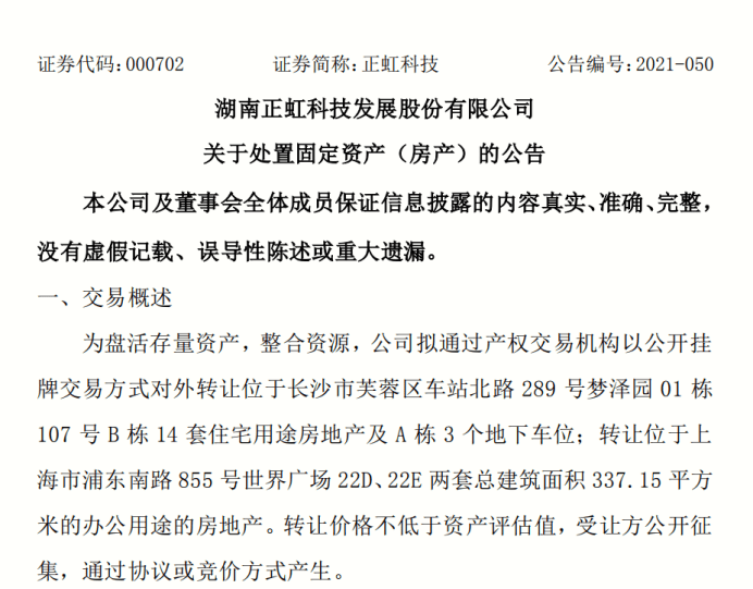 正虹科技称,为盘活存量资产,整合资源,公司拟通过产权交易机构以公开挂牌交易方式对外转让位于长沙市芙蓉区车站北路289号梦泽园01栋107号B栋14套住宅用途房地产及A栋3个地下车位;转让位于上海市浦东南路855号世界广场22D、22E两套总建筑面积337.15平方米的办公用途的房地产。转让价格不低于资产评估值,受让方公开征集,通过协议或竞价方式产生。