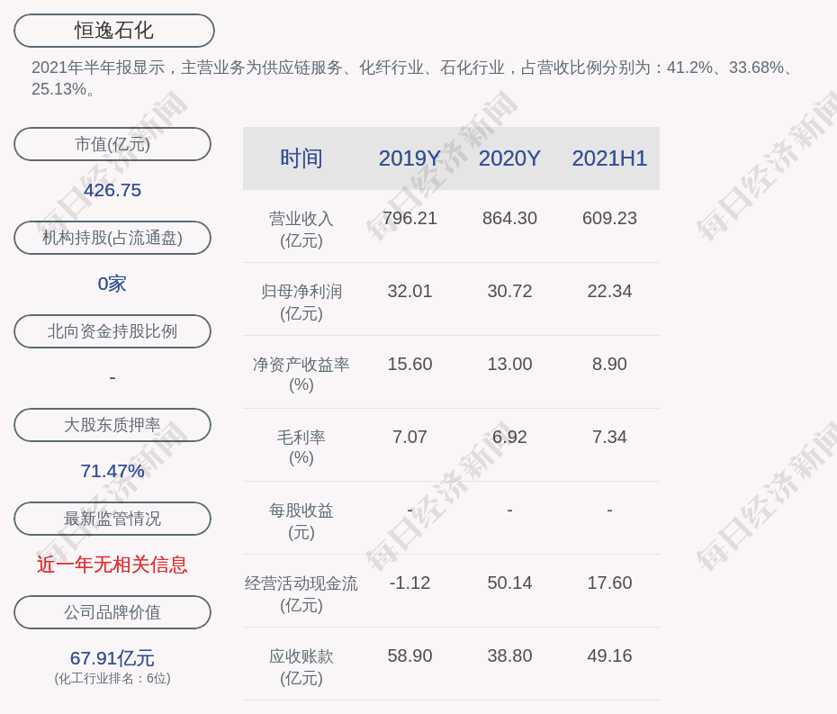 2021年半年报显示,恒逸石化的主营业务为供应链服务、化纤行业、石化行业,占营收比例分别为:41.2%、33.68%、25.13%。