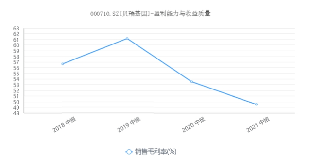 中报显示,今年上半年,贝瑞基因实现营业收入7.34亿元,同比增加1.82%。从收入结构来看,医学检测服务是公司主要收入来源,报告期内实现营业收入2.65亿元,占营业收入比重的36.15%,同比减少21.96%,毛利率为54.85%,同比增加2.05个百分点;基础科研服务实现营业收入1.75亿元,占比23.91%,同比增加7.52%,毛利率为42.01%,同比减少4.57个百分点;试剂销售的营业收入为2.02亿元,占比27.60%,同比增加4.18%,毛利率为56.01%,同比减少9.57个百分点;设备销售的营业收入为5164.60万元,占比7.04%,同比增加273.90%,毛利率为7.19%,同比增加0.39个百分点。同花顺iFinD数据显示,2018年上半年、2019年上半年、2020年上半年及2021年上半年,贝瑞基因销售毛利率分别为56.66%、61.15%、53.50%、49.52%。