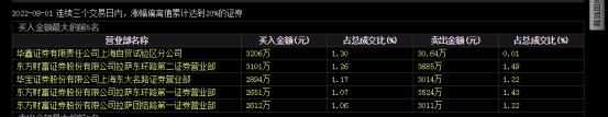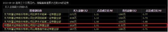 数据显示,8 月 25 日至 9 月 6 日,黑芝麻共登榜 6 次。从龙虎榜公布的买卖数据来看,有"散户大本营"之称的东方财富拉萨军团、金元证券上海东方路证券营业部、华宝证券上海东大名路证券营业部等知名游资均现身。