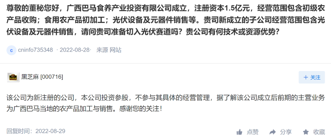 再来看第二条重要信息。8月28日,投资者提问时提到,黑芝麻的参股子公司巴马食养的经营范围里面有“光伏设备及元器件销售”,黑芝麻是不是准备切入光伏赛道?有没有光伏的技术或资源优势?